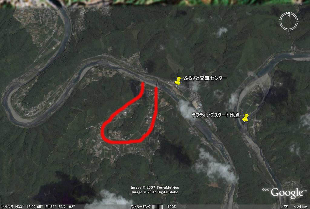 川沿いの平地や小高い丘や森を注意深く地図や航空写真でご覧になって下さい。不思議な地形や光景が浮かんでくると思います。この写真はグーグルアースと言うネットサービスからコピーをさせて頂いたものですが、赤い線をこの写真に加えて見ました。交流センターがある川向いに「大井川」と言う集落があります。この平地は田畑や農家が点在する一見何処にでもある農村集落ですが、地球の歴史で見ると太古の昔は「四万十川」そのものだったのです。赤い線の処を水が流れていたのです。ところが何かのきっかけでこの蛇行がなくなり、まっすぐに流れるようになったと言う訳です。ですから赤い線が取巻く真ん中は今もこんもりとした神社林のように樹木が生い茂っているのです。