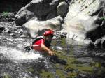 四万十川本流の二次支流である「中津川川」をフィールドとして、<シャワートレッキング>が出来るお奨めのフィールドがあります。スタート地点は中津川一番のお勧め場所でもある「久木の森山・風景林」です。ここから上流に向かって約1キロを遡行します。装備スタイルはヘルメットにライフジャケット、濡れても良い服装で歩き始めます。風景林を出発して直ぐにいきなり全身を水に浸かる事になります。ここ中津川の水温は四万十川・本流に較べるとずいぶんと低く上半身まで水を浴びるにはそれなりの勇気が必要の様です。でも一度浴びてしまうと全身さわやかな気持ちになります。最近の言葉で表現するなら<ハマッてしまう>って感じですね。流れが緩やかな浅瀬をゆっくりと歩けば数多くの鮎を見ることが出来ます。潜らなくても見ることが出来るってなんだか幸せに感じます。淵(ふち)という川の流れが緩やかで水深もかなりあるところでは泳いで遡行するしかありませんがこれが実は愉快なのです。私は勝手に名付けているのですが「ラッコ泳ぎ」でスイスイと上流に向えるのです。淵のような所では流れが大きい処の直ぐそばには逆流と言って下流から上流に流れている部分が必ずあります。ですからこの逆流を上手く利用するのです。しかもライフジャケットを着ているので、平泳ぎなどのように腹を下にするよりもお腹を上にして泳ぎます。トレッキング途中には「飛び込み」に最適な岩場と淵がセットになった処が幾つかあります。参加の子どもたちにとっては最高の場所で、ファミリーで参加のお父さんやお母さんには休憩タイムといったところでしょうか。高さは水面から約2.5メートルほどあって大人でも少々勇気が必要な高さです。やがて、遡行工程の半分を過ぎたあたりで成川という支流が合流している大きな淵に出合うことになります。夫々の川には微妙に水温が違うためこの合流する淵では場所が少し違っただけで暖かい水と冷たい水を同時に感じることになります。正直、あまり気持ちの良いものではありませんね。この淵から少し上流にはトレッキングコース最大の段差がある瀬が現れます。流れの大きな早いところをまともに挑戦するのもいいものです。時間の行程をたっぷりと清流にひたり少しの疲労感を味わいながらトレッキングを終了するのです。