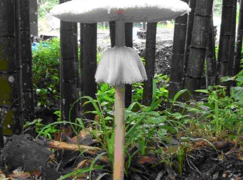 私の住まいする直ぐ隣の竹やぶから珍しいキノコが出ました。背の高さ:約20センチ、傘の大きさ30センチととてもとても大きいのです。しかも、色はほとんど真っ白なんです。少し薄暗い竹やぶではものすごく目立ちます。小さな竹やぶですが全部で5本ありました。さっそく、手持ちのキノコの本<詳細図鑑 きのこの見分け方>で調べたのですが、本に掲載のきのこには無く、同定出来ませんでした。竹やぶの中で数本がにょきっと出ているので、間違いなく同定出来ると思ったのですが今の処わかりません、、。調べた本は山や里で比較的よく見られるしかもお勧めの美味しいきのこの特集でした。66種の美味しいキノコと間違いやすい毒キノコ7種を収録。日本のキノコはおおよそ名前がついているだけで3,000種類もあるそうで、発見したキノコもどこかの分類にはいるのでしょうが特定出来ずに残念です。これから本格的な秋に向ってキノコたちのシーズンになるでしょう。甘い考えですが出来ればこの本にある美味しいキノコを発見したいものです